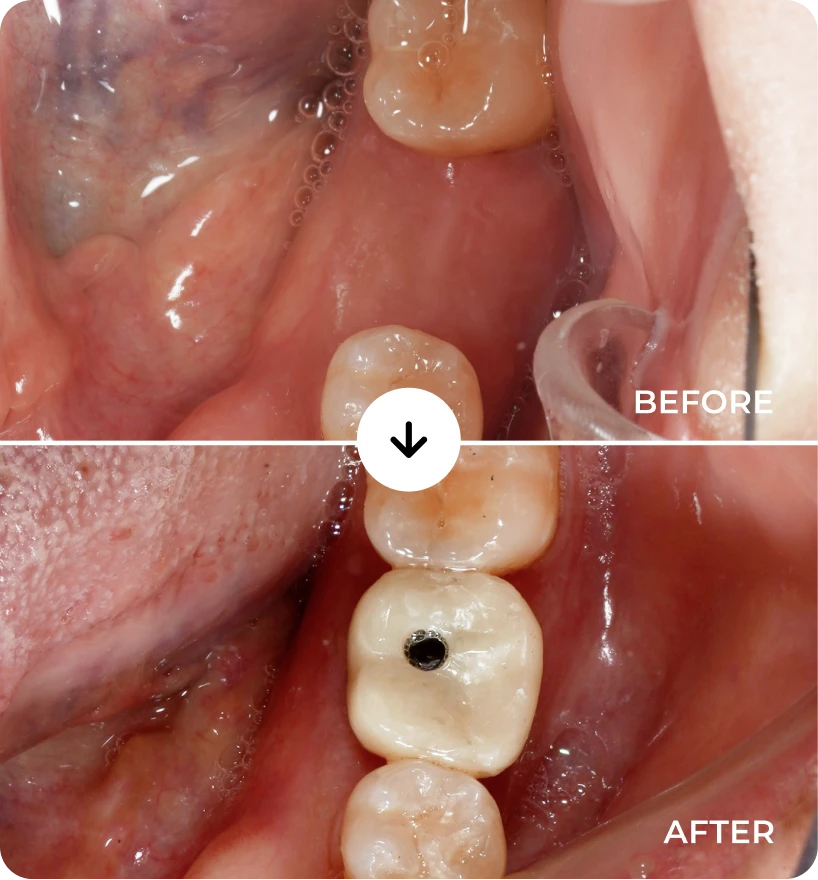 โดยทันตแพทย์จะฉีดยาชาเฉพาะที่และผ่าตัดฝัง รากเทียม ซึ่งเป็นการผ่าตัดเล็ก ไม่ต้องพักฟื้น รอรากฟันเทียมยึดติดกับกระดูกขากรรไกร ประมาณ 2-3 เดือน แล้วจึงมาใส่ครอบฟัน ในขั้นตอนถัดไป